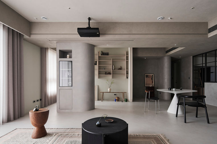Soft curves — from storage walls and column structures to a central round table — guide the flow subtly, leading the eye toward the sunlit windows. A playful nook between the hallway column and the child’s room forms a quiet pause between public and private zones, adding depth and a sense of discovery to everyday living.