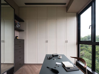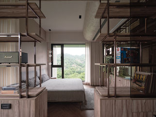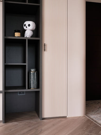 To make the most of the compact space, living and sleeping zones are subtly defined using transparent shelving and bronze glass, balancing openness with privacy. The result is a warm, personal space where every corner tells a story.